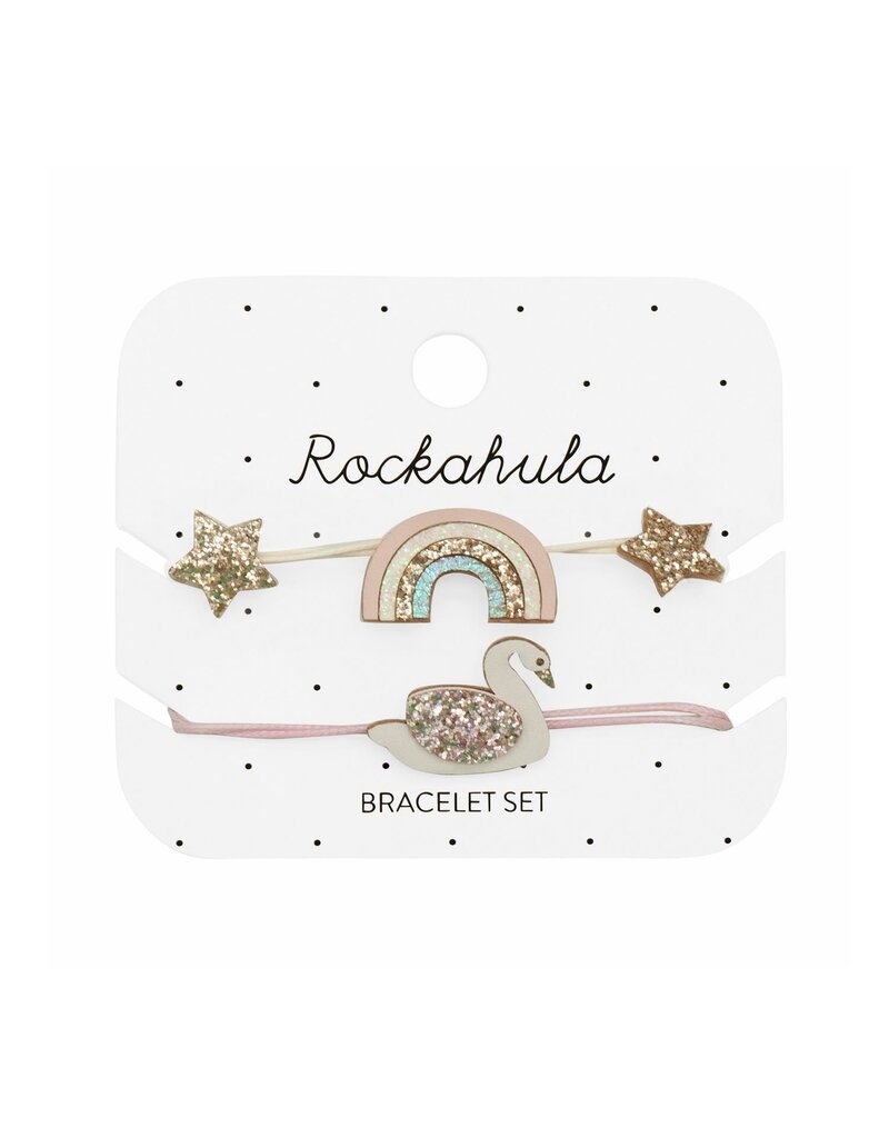 The most enchanted little rainbow bracelet and swan set! One bracelet features our pretty pastel rainbow with gold stars, and the other a graceful swan with gold wings. Both are set onto soft pastel coloured cord with a lobster clasp fastening and extender chain to ensure a good fit.
